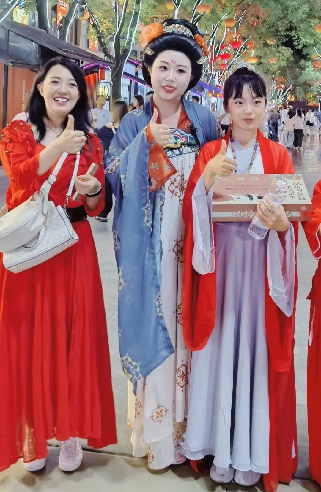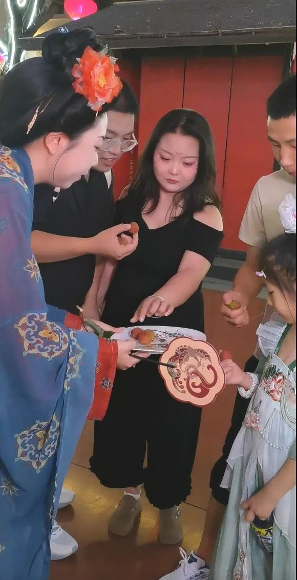 活动的文化体验从会客厅延伸至西安地标大唐不夜城。夜幕降临,荔枝化身为文化信使,在盛唐气象与现代繁华间架起桥梁。开元广场上,身着华美“凤凰衔绶”汉服的“唐美人”驿使,向游人递送装有岭南鲜甜荔枝与温泉体验券的精美礼盒,传递穿越时空的情谊。贞观之治雕塑群前,“穿汉服·品从化鲜荔”的互动邀约吸引众多游客驻足参与。汉服店内的荔枝纹饰拓印体验区人头攒动,参与者亲手拓印荔枝图案,换取鲜果或丝绸书签,岭南风物之美在互动中悄然浸润人心。