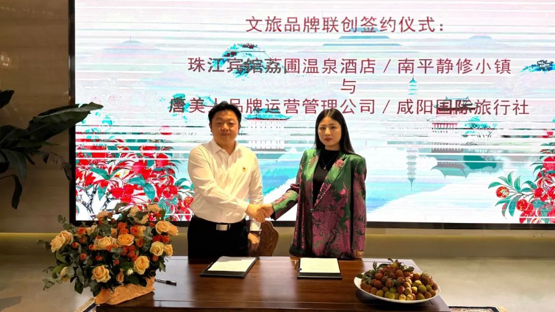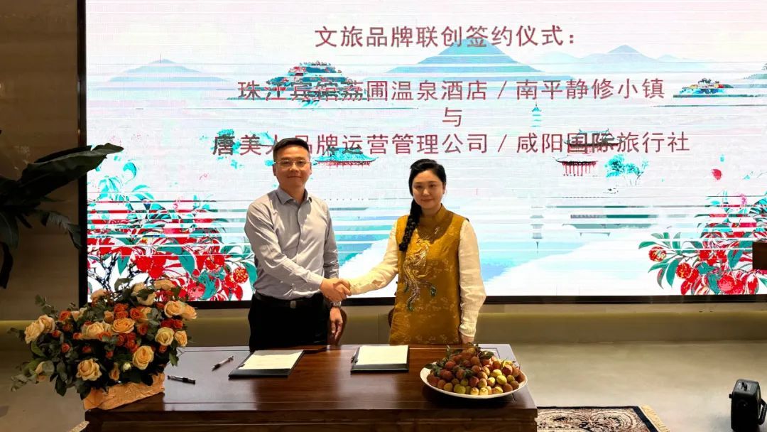 紧随其后的是文旅品牌联创签约仪式。珠江宾馆荔圃温泉酒店、南平静修小镇分别与唐美人品牌运营管理公司、咸阳国际旅行社签署了合作协议。