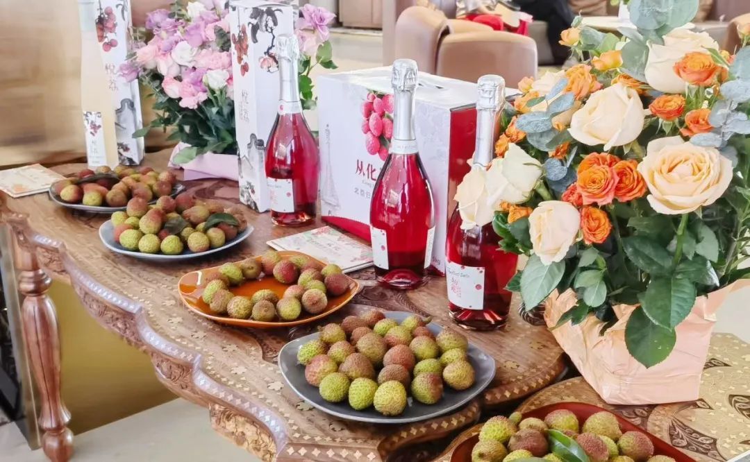 6月7日,西安浐灞丝路会客厅内果香弥漫,气氛热烈。在精心打造的“凤凰衔绶”主题展台旁,刚采摘的从化鲜荔陈列以待,邀来宾共品甜蜜风味;顺昌源荔枝酒香气氤氲,引得众人驻足询问,现场氛围热烈。